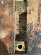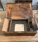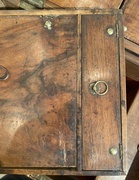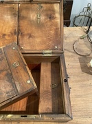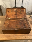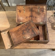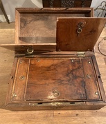 Coffret de changeur en noyer de la fin du XVIIIeme avec à l.interieur des conpartiments dans le couvercle et un écritoire amovible deciuvrant en partie basse deux boîtes fixés de chaque côté fermants à clé. Sur chaque côté une vis traversante pour le fixer sur une surface plane.