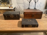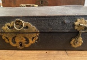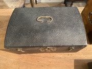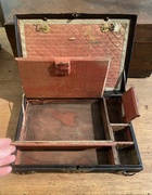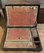 Écritoire de voyage d époque L XIV recouvre de cuir noir avec tout son intérieur en soie d origine, croisillons de fils d or a l intérieur petit coffre fermant à clé deux compartiments pour l encrier et petite boîte pour les mines et accessoires très bel état d origine rien ne manque, son entrée de serrure, ses crochets poignées etc